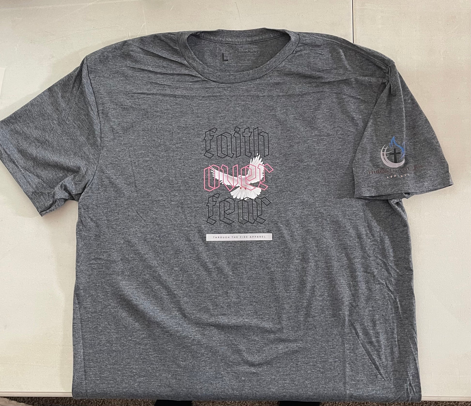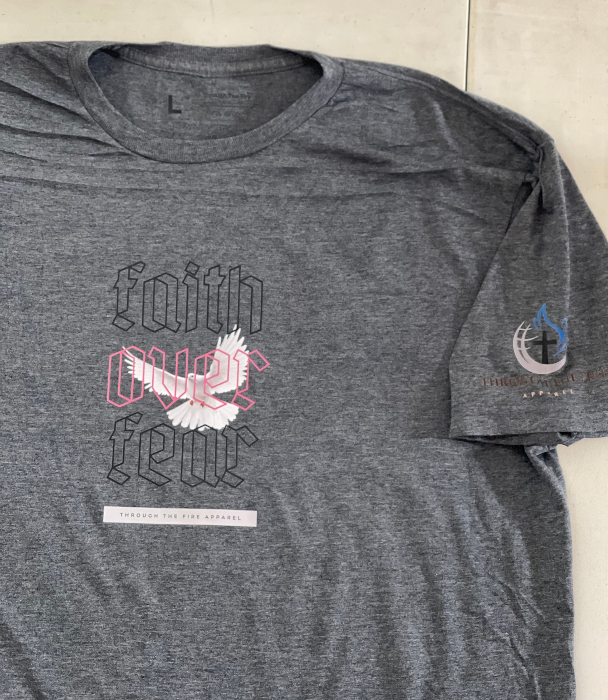 This is a ready to ship product. Faith over Fear with Logo on the left sleeve and a tag less label.